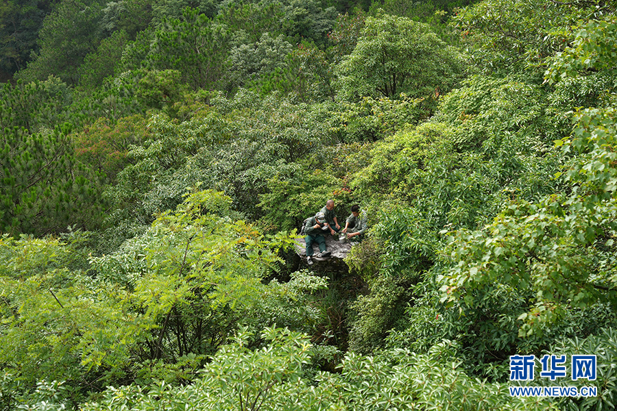 在廣西元寶山國家級自然保護區,羅定明和同事在進行林地巡查。