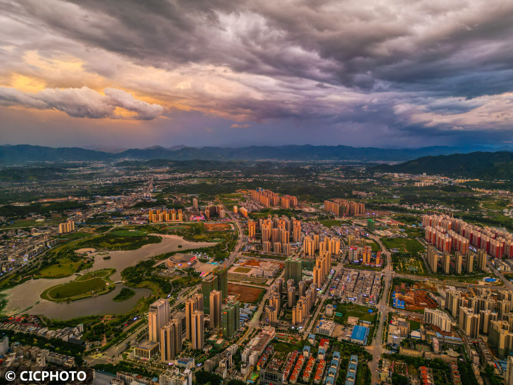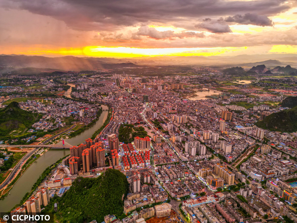 以上圖片:2022年8月9日在廣西賀州市拍攝的晚霞。(無人機照片)CICPHOTO/廖翔 攝
