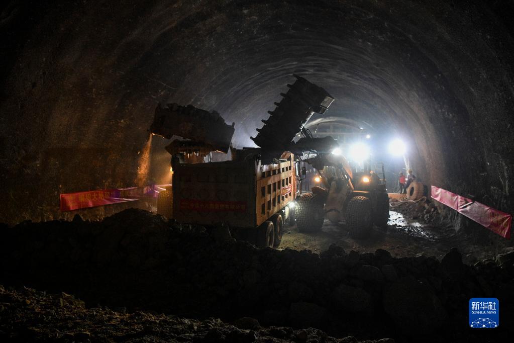 8月17日,在位于廣西環江毛南族自治縣的貴南高鐵九萬大山四號隧道內,挖掘機在清理隧道貫通爆破后產生的土石方。