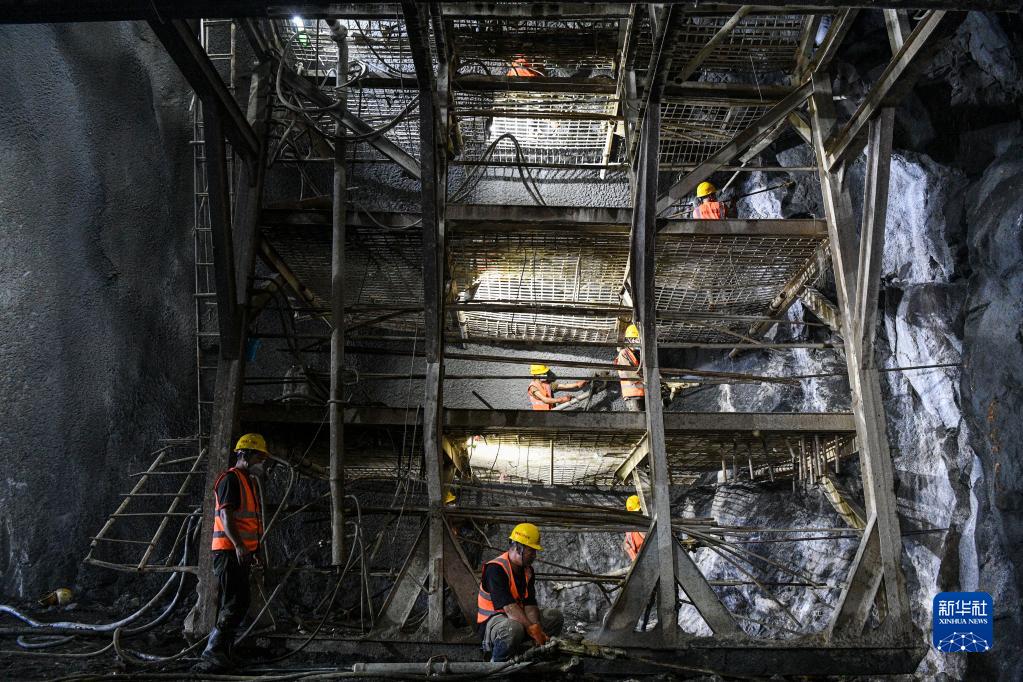 8月16日,在位于廣西環江毛南族自治縣的貴南高鐵九萬大山四號隧道內,工作人員用風槍打爆破眼。