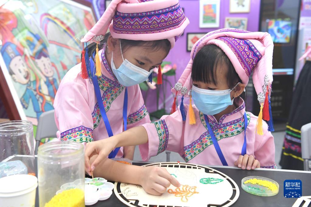 8月20日,兩名孩子在廣西南寧國際會展中心點米成畫。