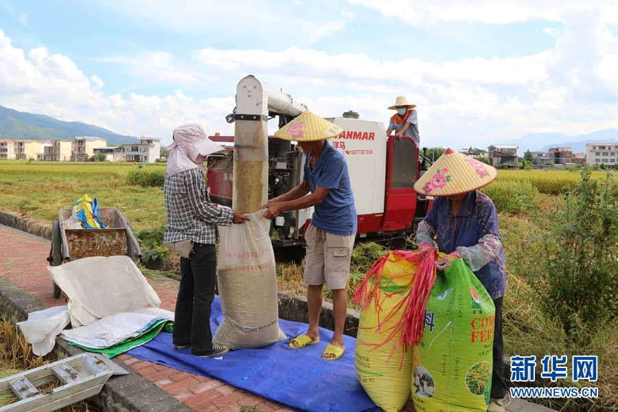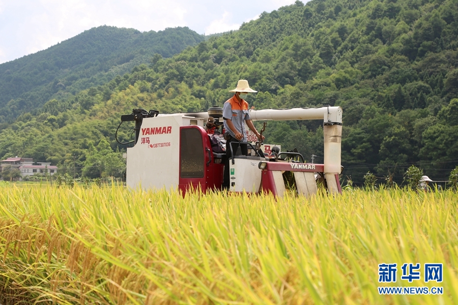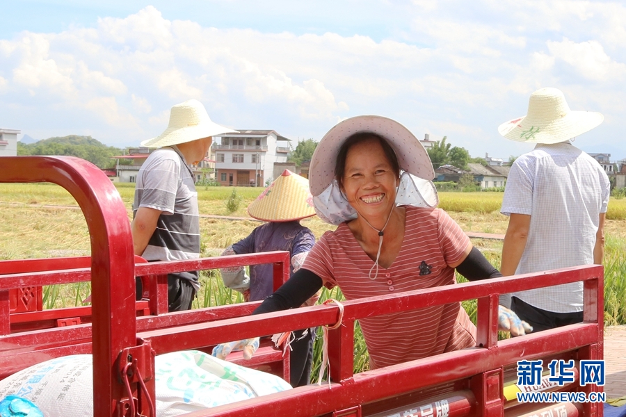 夏末時節,廣西灌陽超級稻進入收割期。灌陽縣黃關鎮聯德村神農稻博園水稻核心示范區基地里,連片的超級稻一片金黃,沉甸甸的稻穗在微風下低垂著頭,水稻收割機在稻田里來回穿梭,“吞吐”著金燦燦的稻穗。