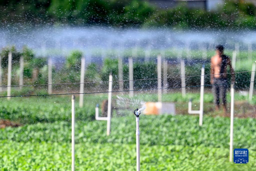 8月27日,在柳州市柳江區進德鎮四連村,菜農打開噴灌系統給蔬菜澆水。