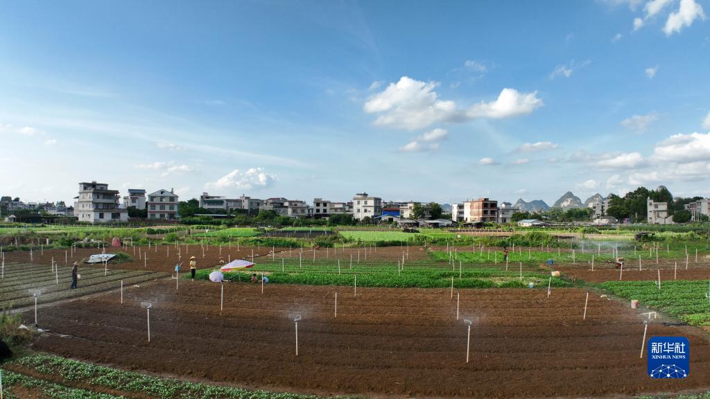 8月27日,在柳州市柳江區進德鎮四連村,菜農打開噴灌系統給蔬菜澆水(無人機照片)。
