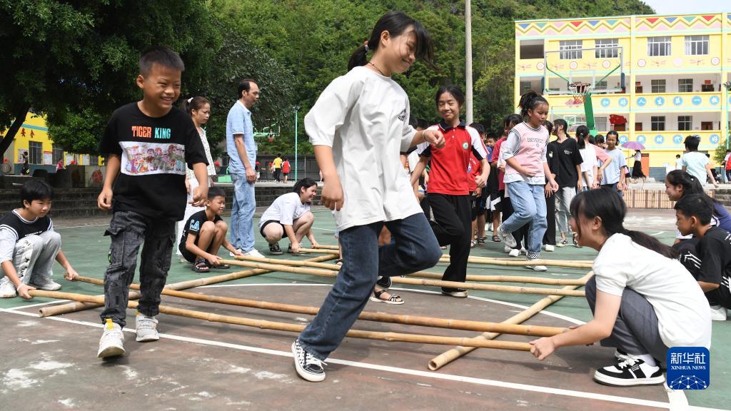 9月1日,廣西大化瑤族自治縣六也鄉六也中心小學的同學們在大課間活動中跳竹竿舞,歡慶新學期開學。