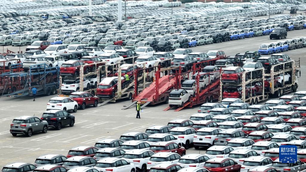 9月11日,工人在廣西柳州汽車城一家物流園里把商品車裝上貨車(無人機照片)。