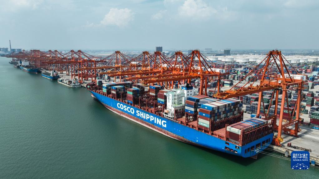 多艘海輪停泊在欽州港集裝箱碼頭裝卸貨物(2022年9月13日攝,無人機照片)。