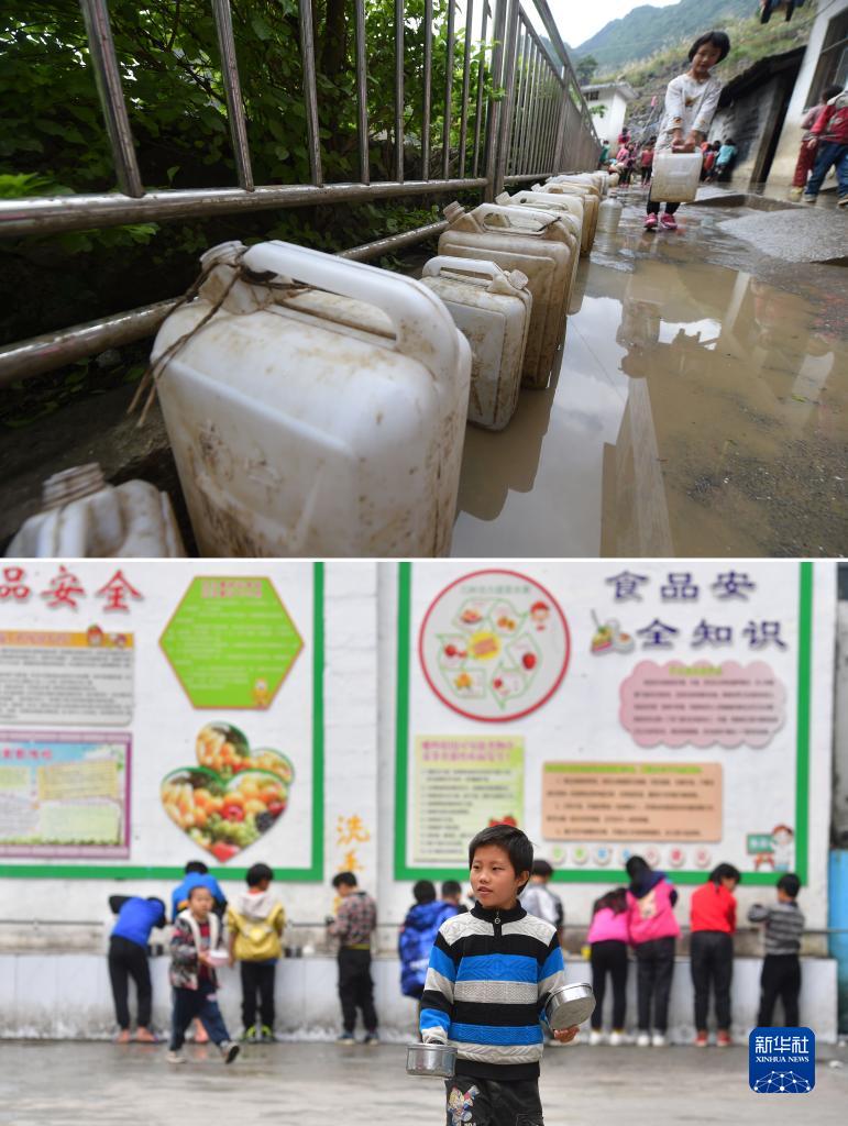 上圖:在廣西大化瑤族自治縣板升鄉八好小學,同學們用儲備在水桶里的雨水淘米煮飯(2014年11月24日攝);下圖:同學們用自來水洗碗(2021年3月16日攝)。八好小學曾經非常缺水,學生需定期定量用水。如今,學校用上了自來水,“飲水難”問題得到解決(拼版照片)。