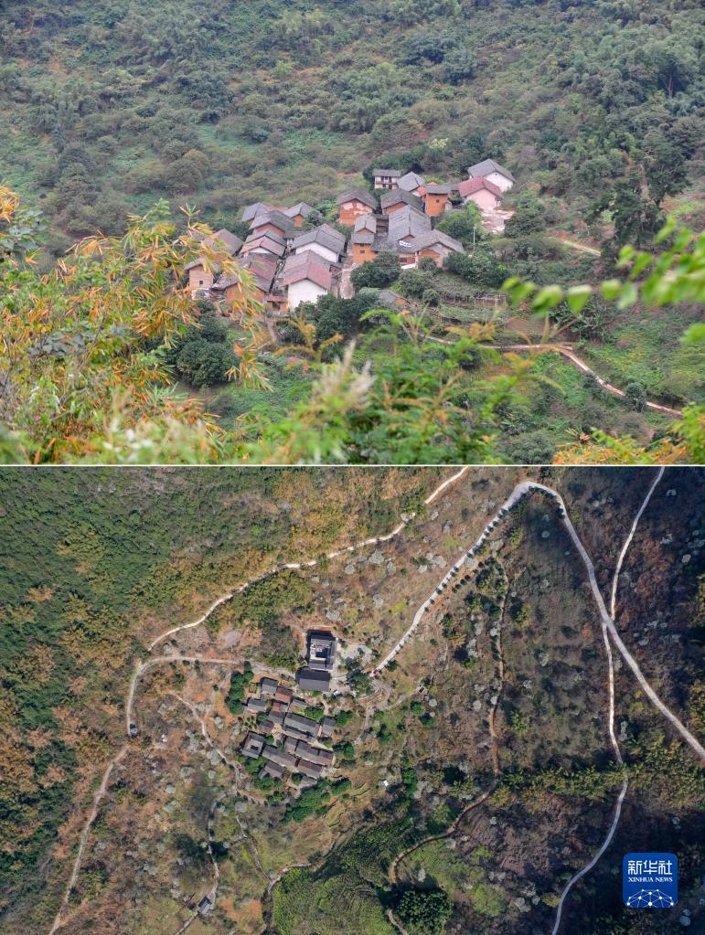 上圖為2012年10月21日拍攝的廣西融安縣東起鄉崖腳村銅板屯;下圖為2021年2月12日拍攝的銅板屯(無人機照片)。銅板屯曾是當地有名的“空心村”,一度只有6位老人留守,整個村莊瀕臨消逝。10年來,在當地政府的扶持下,返鄉青壯年實施“故鄉拯救計劃”,發展生態觀光旅游產業。如今,銅板屯面貌發生翻天覆地的變化,已成為當地的“網紅村”(拼版照片)。