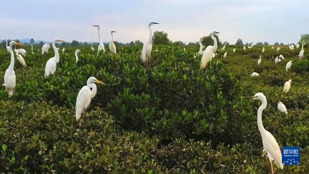 在廣西山口紅樹林生態國家級自然保護區,鳥兒在紅樹林中棲息(8月22日攝,無人機照片)。