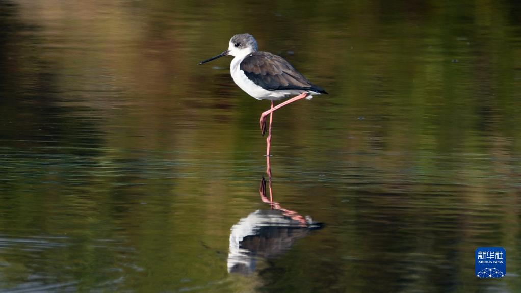 一只鳥在廣西山口紅樹林生態國家級自然保護區的水中停留(10月23日攝)。