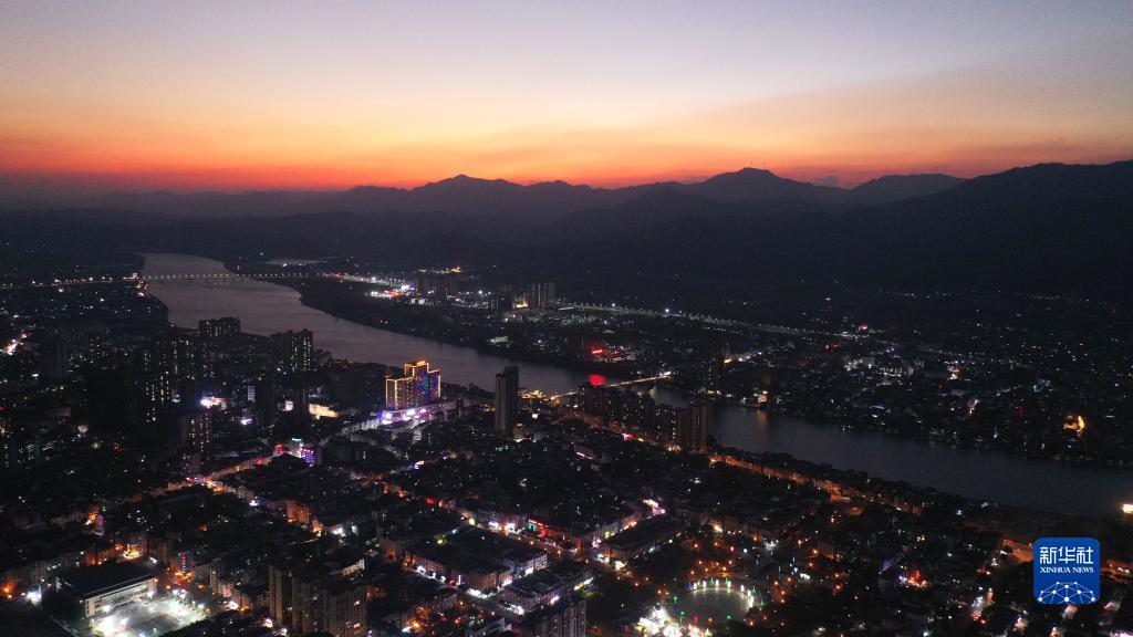 晚霞映襯下的廣西融安縣融江河畔(無人機照片,10月31日攝)。