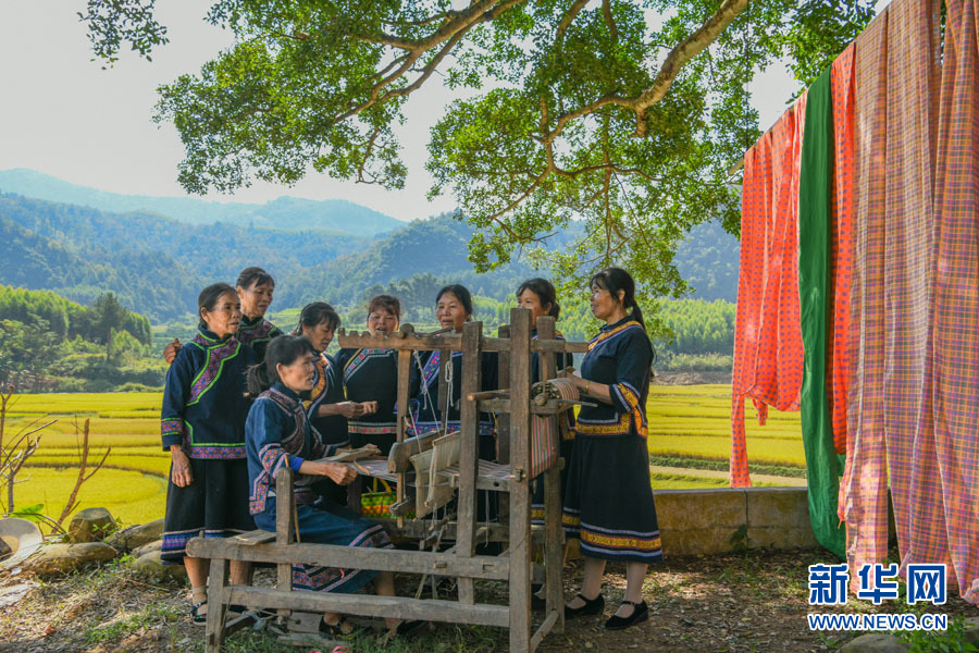 圖為德保壯族婦女展示隘章土布技藝。隘章土布保留了純粹的手工紡織技藝,古樸的色調和紋樣留存著淳樸的鄉情風味。(黃少將 攝)