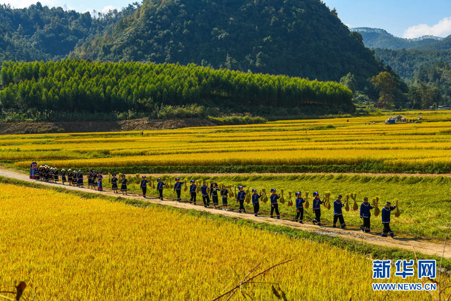 圖為身著民族服飾的壯家兒女挑滿擔稻谷走過田埂。(黃少將 攝)