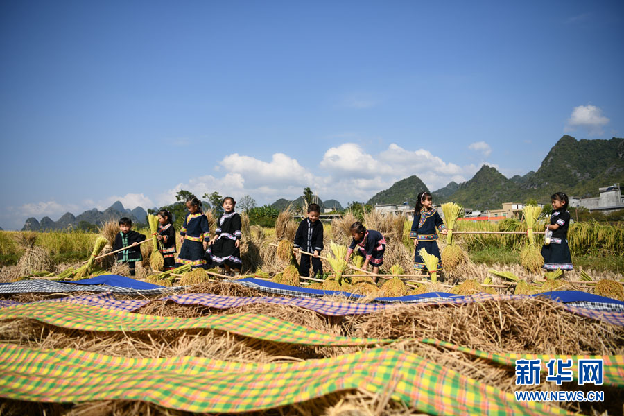 圖為壯族群眾在稻田間收稻谷曬土布。(黃少將 攝)