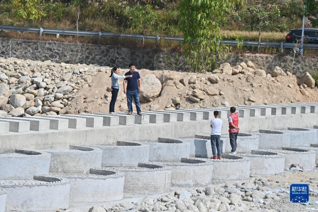 在廣西融水苗族自治縣香粉鄉雨卜村,來自廣東省廉江市的掛職干部李杰(左二)和當地干部在查看旅游設施建設情況(11月8日攝)?;浌饏f作資金正助推雨卜村鄉村旅游產業發展。