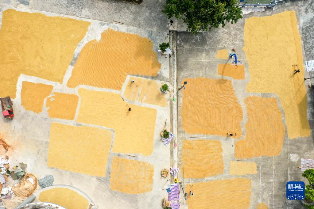 11月9日,在興業縣葵陽鎮葵聯村,村民將收獲的稻谷攤開晾曬(無人機照片)。