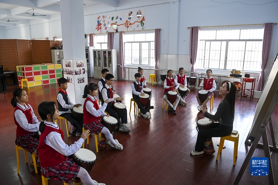 11月9日,在廣西興業縣石南鎮至德小學,學生們在學習非洲鼓。