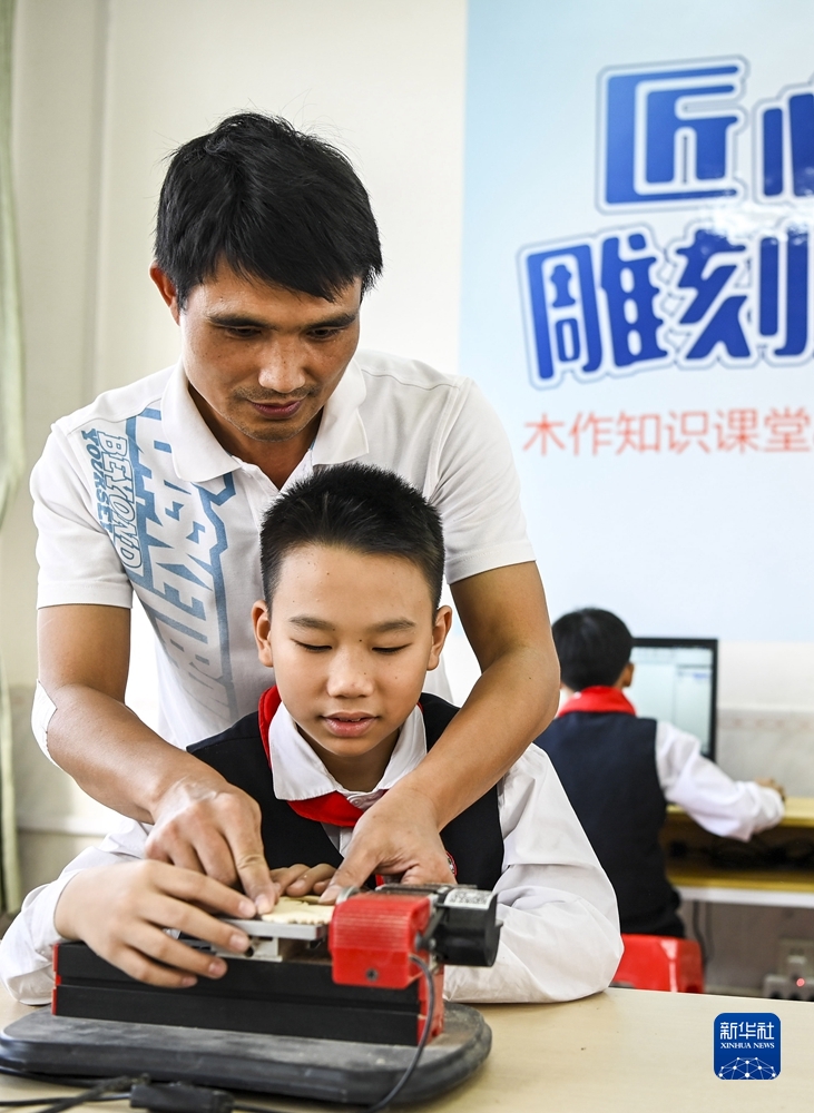 11月9日,在廣西興業縣石南鎮至德小學,老師教學生打磨木質構件。