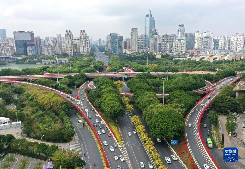 初冬時節,廣西南寧市樹綠花紅,豐富的色彩扮靚了城市。