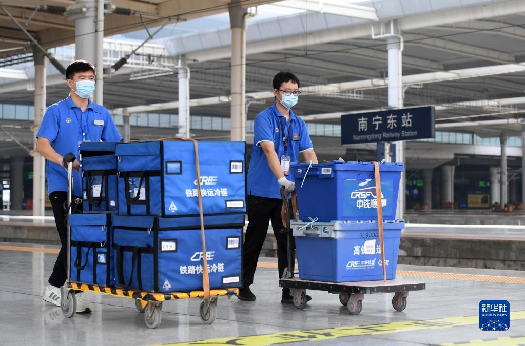 11月11日,中鐵快運南寧東站營業部工作人員在南寧東站搬運快運件。