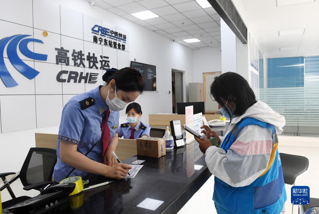 11月11日,在中鐵快運南寧東站營業部,工作人員(左)在辦理快運業務。