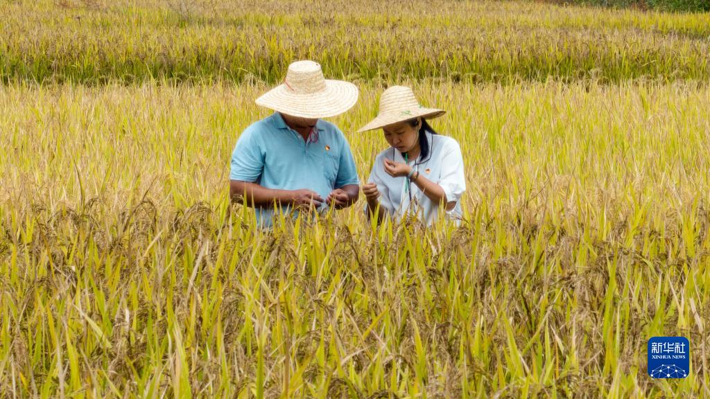 在欽州市欽北區貴臺鎮百美村委那疋村,利遠遠(右)和村黨支部書記梁顯茂在查看紫米的飽滿度(11月11日攝)。