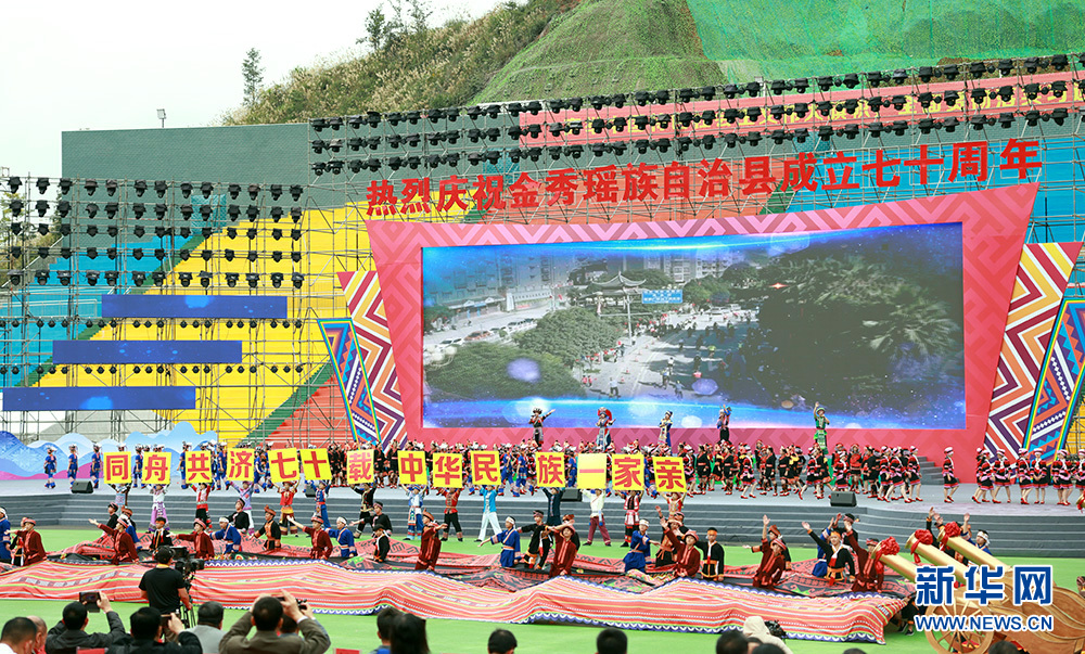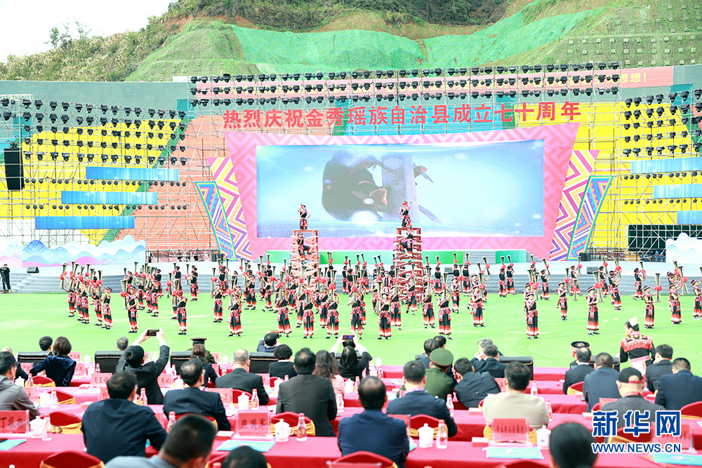 慶祝大會上進行了群眾文藝表演,各族群眾身著節日盛裝,表演了以《豐碑》為序,《鼓醉瑤山》《幸?,庎l》《青山秀水》《瑤城印象》《奮進瑤山》等五個篇章的文藝節目,展現了民族區域自治政策支持下,金秀各族人民守望相助、相親相愛、踔厲奮發、勇毅前行的精神面貌。