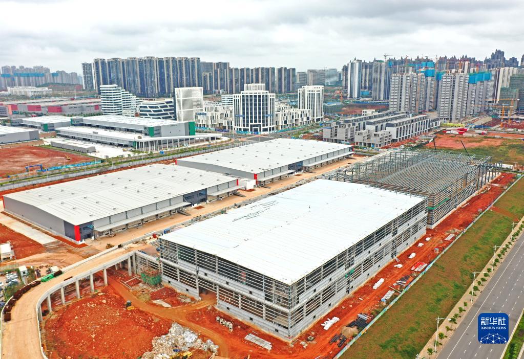 這是進行頂棚施工的中新南寧國際物流園的電商物流園(11月29日攝,無人機照片)。