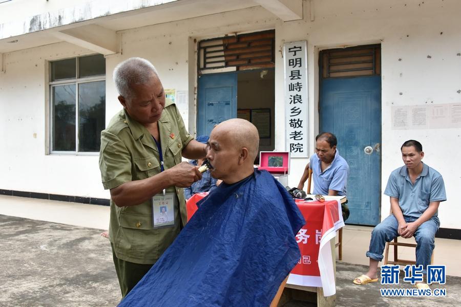 圖為劉日成在寧明縣峙浪鄉敬老院為老人理發。(陳桂梅攝 拍攝時間:2022年11月19日)