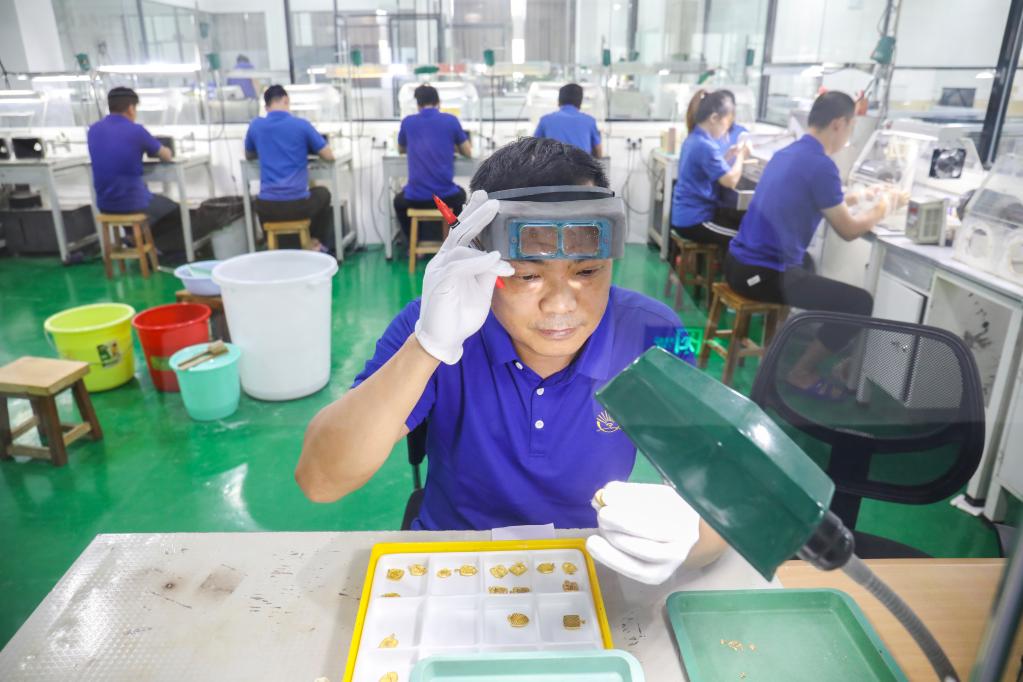 塑形、雕刻、拋光……在位于廣西賀州市黃金珠寶產業園的一一一珠寶首飾有限公司,工人們正小心翼翼地對手中的黃金進行加工處理。不久后,這些精美的飾品、擺件將進入全國各大珠寶品牌商店。
