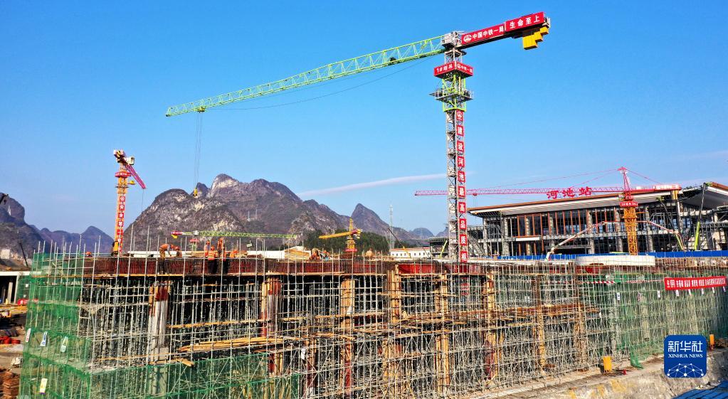 1月1日拍攝的建設中的貴南高鐵廣西河池站前廣場建設工地。