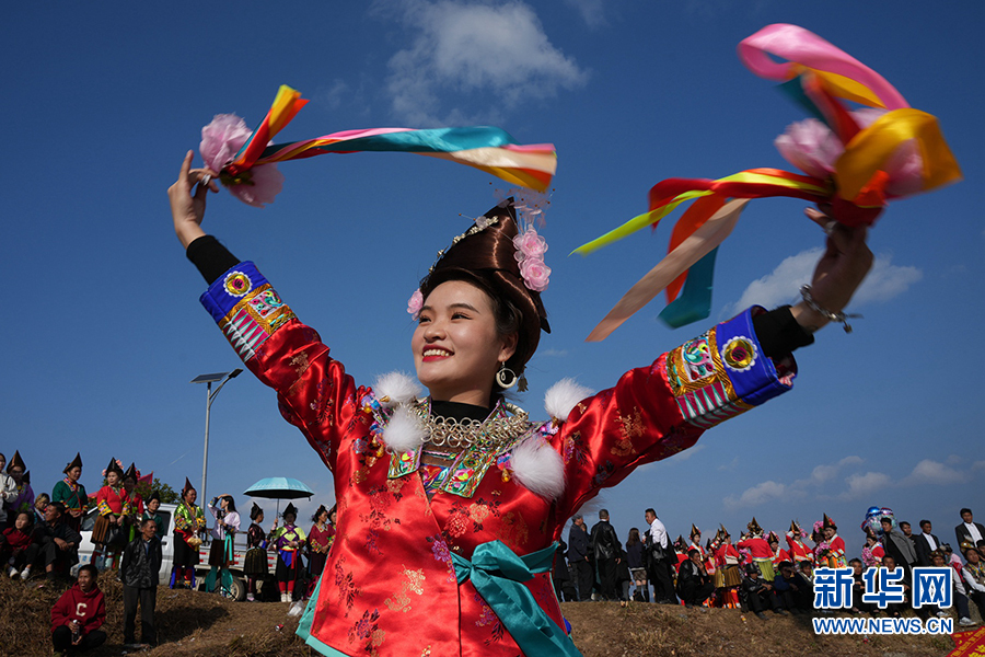 一位苗族女子翩翩起舞喜迎新年到來。新華網發 龍濤 攝