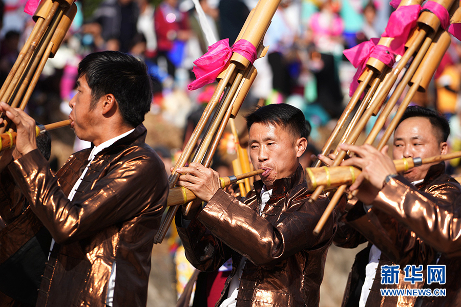 苗族男子吹奏蘆笙喜迎新年到來。新華網發 龍濤 攝