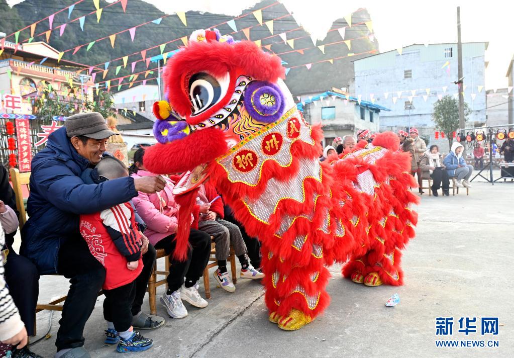 1月17日,村民在“村晚”活動上與舞獅表演者互動。