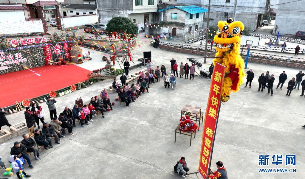 1月17日,村民在“村晚”活動中觀看舞獅表演(無人機照片)。