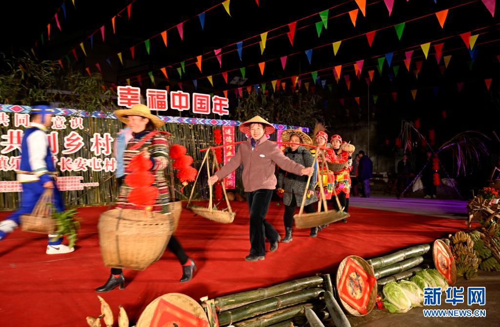 1月17日晚,村民扛著農具在“村晚”活動上走秀。