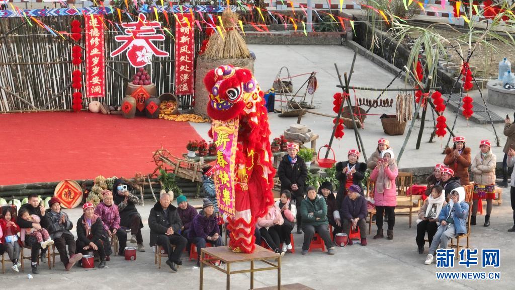 1月17日,村民在“村晚”活動中觀看舞獅表演(無人機照片)。