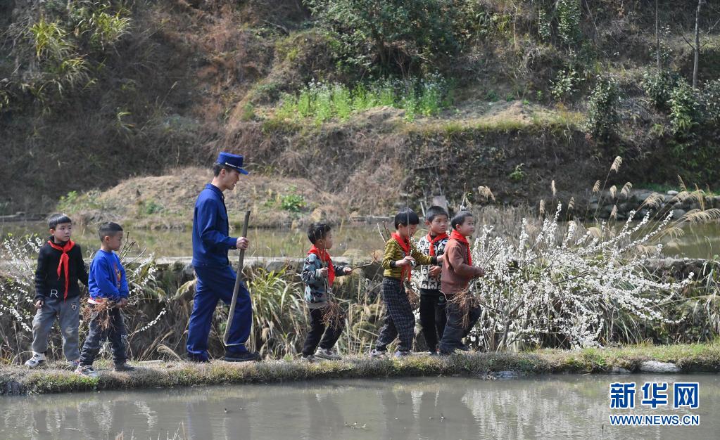 2月27日,在融水縣桿洞鄉黨鳩村,消防隊員和小學生前往田間種樹。
