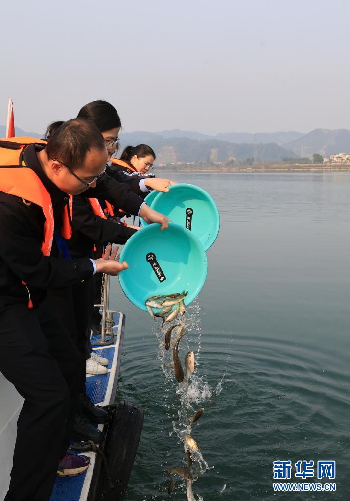 3月10日,在廣西柳州市融安縣,工作人員在融江放流魚苗。