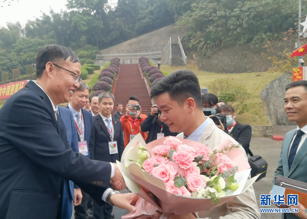 中方工作人員給越南游客送上鮮花。新華社記者 梁舜 攝