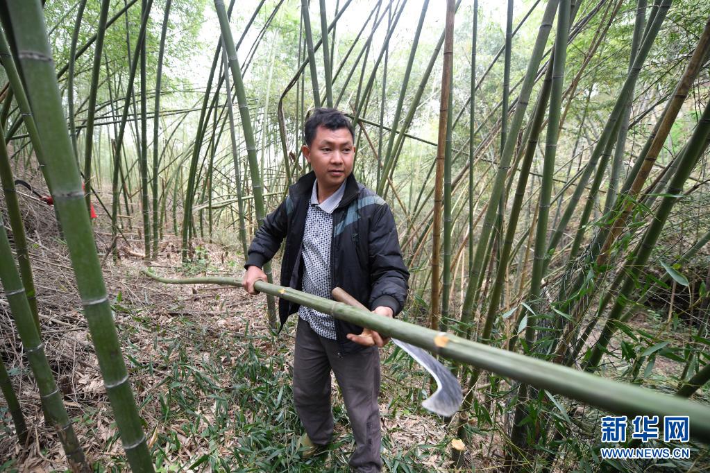 3月15日,在廣西金秀瑤族自治縣忠良鄉巴勒村,村民砍伐竹子準備編織竹編產品。
