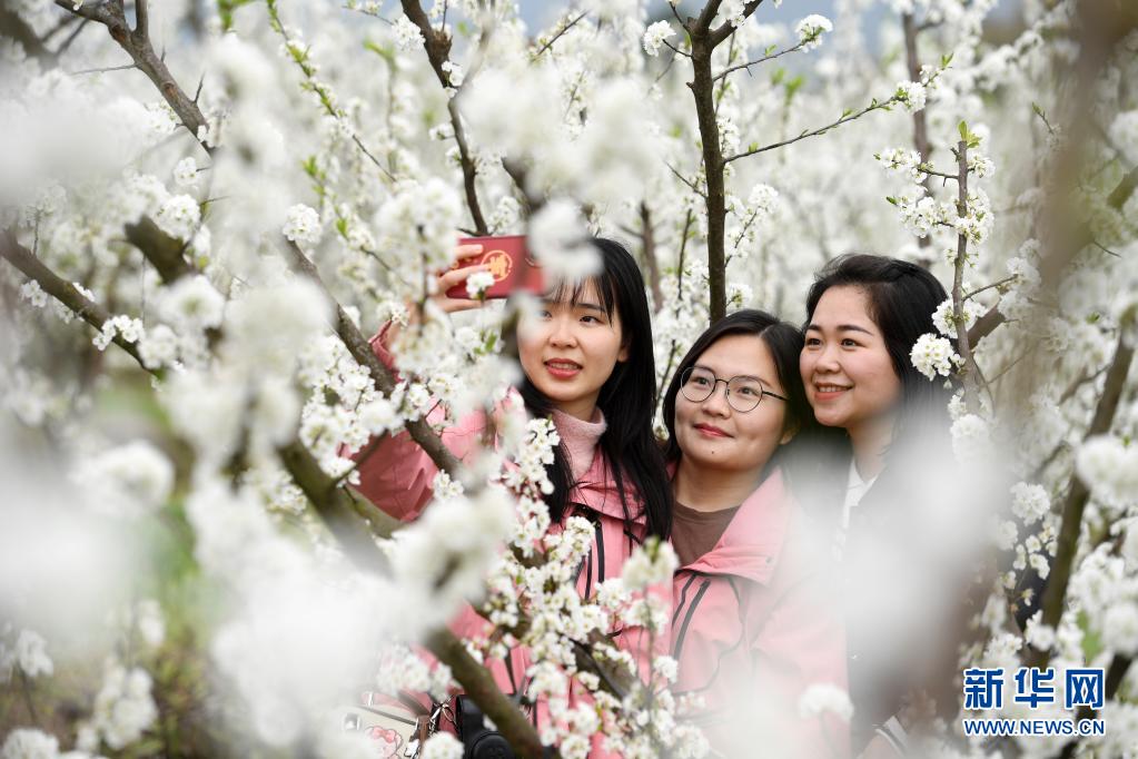 3月17日,在廣西金秀瑤族自治縣忠良鄉巴勒村,游客在賞花拍照。