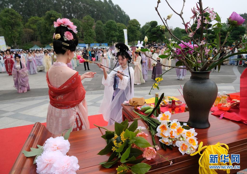 3月18日,身著古風服飾的人們在廣西南寧園博園參加花朝盛典活動。