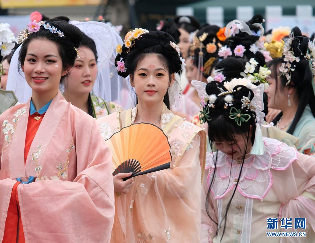 3月18日,身著古風服飾的人們在廣西南寧園博園參加花朝盛典活動。