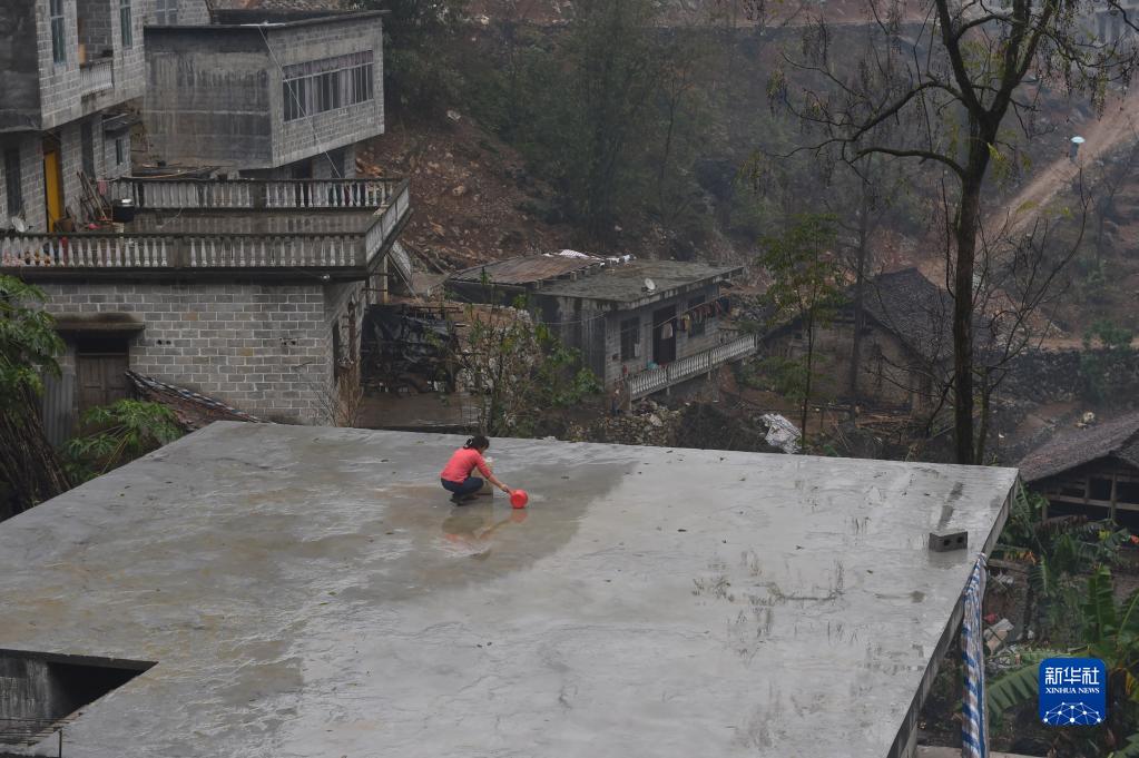 在廣西大化瑤族自治縣板升鄉弄勇村弄朝屯,一陣大雨過后,村民在收集房頂上的積水(2015年2月12日攝)。