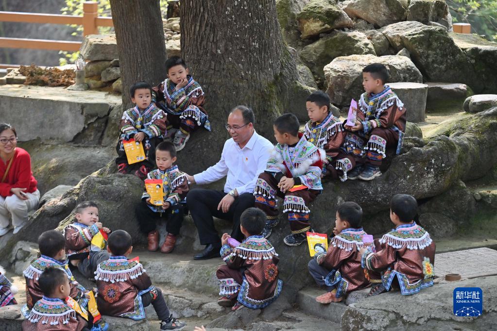 3月22日,在廣西融水苗族自治縣桿洞鄉黨鳩村,來自廣東省廉江市安鋪中學的支教老師黃廉春在給小學生介紹海洋知識。