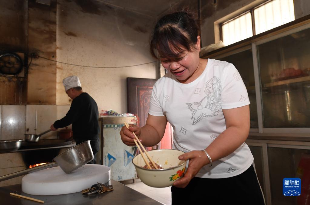 在廣西德??h東凌鎮那王小學,黃秀碧(右)和黃永勇在給學生做午餐(3月22日攝)。