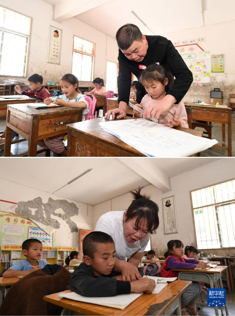 這是一張拼版照片:在廣西德??h東凌鎮那王小學,黃永勇(上圖)和黃秀碧(下圖)在課堂上輔導學生功課(3月22日攝)。
