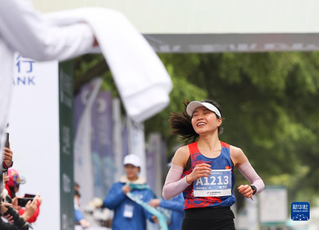 3月26日,廣東選手陳飛潔沖過終點線。她以2小時51分33秒的成績獲得女子全程冠軍。